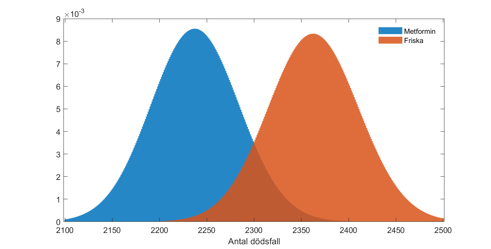 Kan denna skillnad ha uppstått av en slump. Ställer vi upp en matematisk modell där vi gör det förenklande antagandet att varje individ följs exakt 2 år och att individerna under denna tidsperiod dör oberoende av varandra med en fix sannolikhet per år får vi som sannolikhet (risk) att dö 1,44 % på ett år för patienter som tar metformin och 1,52 % på ett år för friska patienter. Sett över två år ökar sannolikheterna till 2,86 % respektive 3,02 %. Antalet som skulle dö under denna tvåårsperiod är i bägge grupperna binomialfördelat och fördelningarna ser ut som följer: